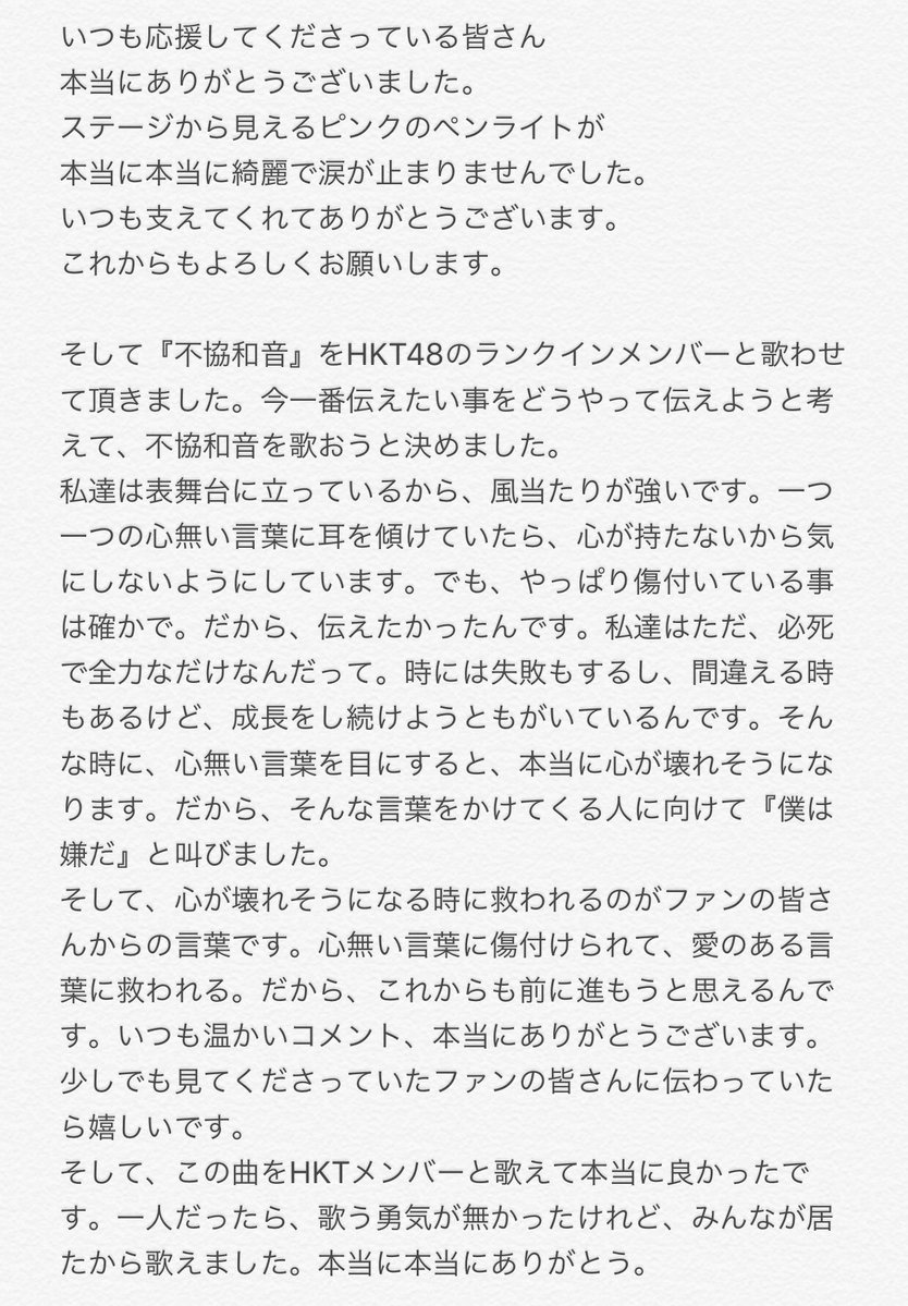 「いい曲ならばよその曲でも何でもやってライブが盛り上がればOK。HKTとしてのプライドはオリジナル曲をやることより、ライブが盛り上がってファンが満足さたかどうかに感じるべき」という感じ。