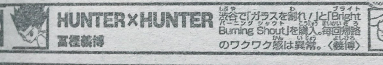 ハンターハンター、冨樫先生、最近毎週何かしらの欅坂46のネタ(しかもファンでもわかりにくいやつ)必ず入れ込んでて、欅ネタ入れるのが連載のモチベーションになっている気がしないでもない。