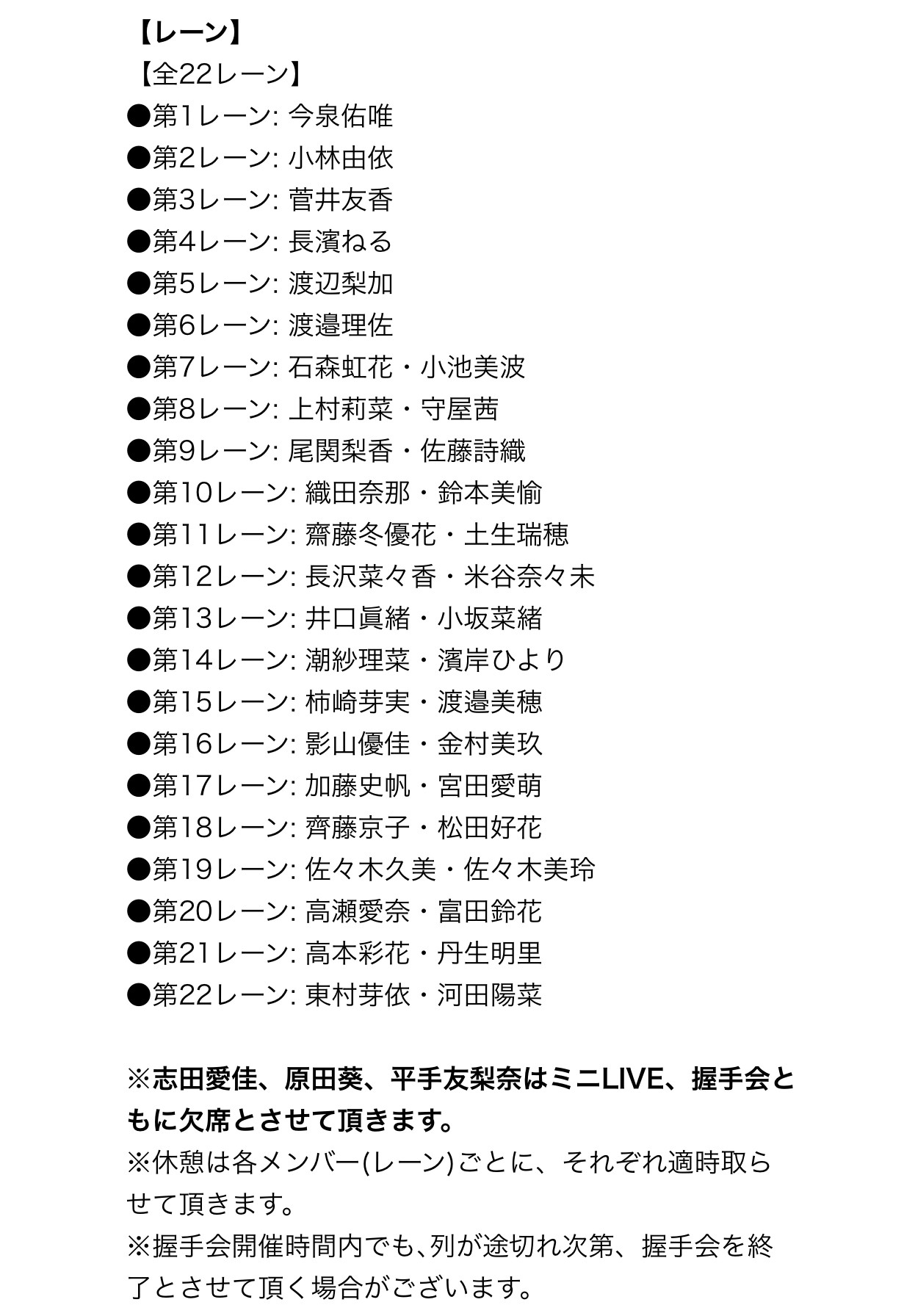 ※志田愛佳、原田葵、平手友梨奈はミニLIVE、握手会ともに欠席とさせて頂きます。