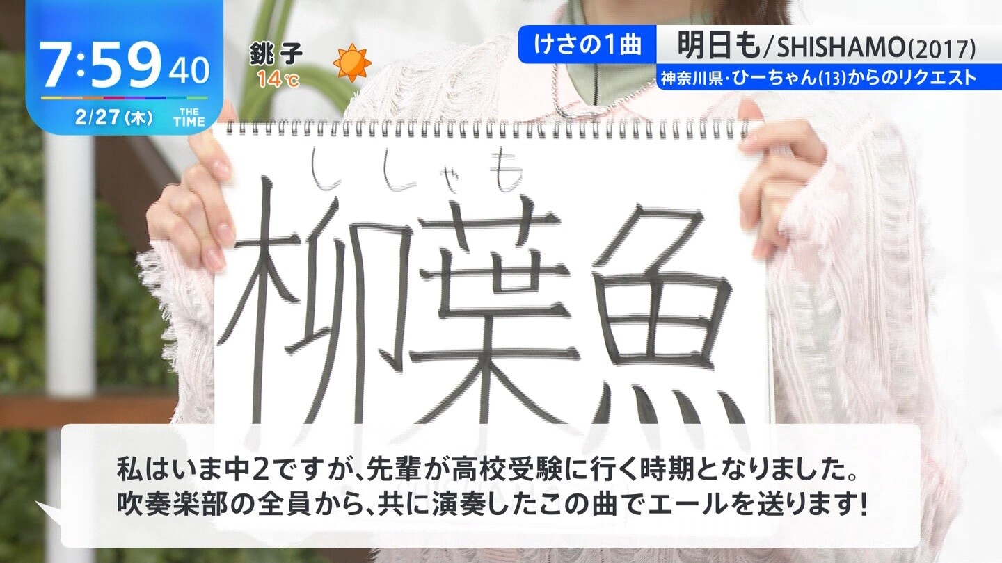 笑顔でししゃもを漢字で書いたスケッチブックを持つまつり笑笑